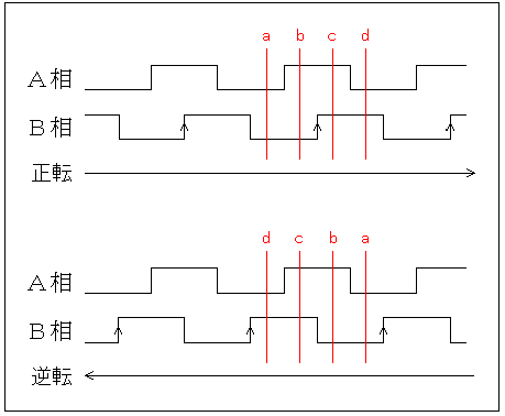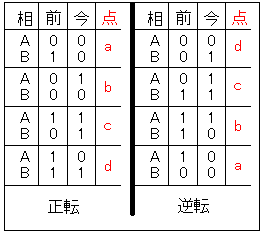 先日、ネットサーフィンをして調べ物をしている間にふと気になった事が掲示板に書かれていました。 その書き込みでは「PICで2相ロータリーエンコーダの入力ってできない?」というものでした、返答に「H8などのマイコンには標準で命令があり入力ができるので、そちらを使った方がいい」「PICに2相エンコーダの入力はプログラム上絶対に無理」との回答しかなく、へぇ〜そうなんだぁーと思って他にも調べてみたら同様の記事ばかりでしたのでやっぱ無理なのか〜と思いページを閉じた時・・・できんじゃん!簡単にと頭の中では解決しましたw 原理とプログラムは簡単ですが、説明が長いのと履歴に埋もれて書き込みがあった掲示板に辿り着く事ができないのでここに記そうと思います。(元がかなり古い書き込みだったのでもう解決している人がいたらごめんね) まず2相ロータリーエンコーダーについて調べてみます。 こちらのサイトにハード的な原理が詳細に解説されていました。( 勝手にリンクしてごめんちゃいm( __ __ )m ) ![]() 正転時、逆転時とも出力信号はA、Bの位相差90°であり回転方向により、ずれ方が異なります。 ロータリーエンコーダーで検知できる動作は、回転方向・回転角度・回転数・回転速度、ですがここではまず回転方向について考えましょう。 左図のabcdの部分に注目してください。 正転、逆転とも4種類の信号状態があり逆になっているだけです。 正逆を判断するのは簡単で、今現在の信号状態を記憶し変化した信号と照らし合わせるだけです。 問題はPICにコンペア命令が無いことですが、状態を記憶するための一時保存レジスタと条件判断命令で簡単に再現できます。 ソースコード上での各フェーズは、A相をフェーズA(PHA)・B相をフェーズB(PHB)として扱いRAポート2をA相・RAポート3をB相の入力として割り当てて扱います。 オープンドレインなのでオン・オフが逆の表記になっています。 頭の中に浮かんだ物を簡単にソースコードにした結果は以下のようなもので片側の相に注目しその時のもう一相の状態を前の状態と比較するというものです。 ;-----------------------低速スクロール------------------------ BTFSS PHB ; PHB=1? GOTO PHBON ; フェーズBオンへ PHBOFF ; フェーズBオフ・ルーチン MOVFW RA ; RA→W MOVWF RATEMP1 ; W→RATEMP1 BTFSS RATEMP1,2 ; RATEMP1<2>=1? GOTO PHAON ; フェーズAオンへ GOTO PHAOFF ; フェーズAオフへ PHBON ; フェーズBオン・ルーチン MOVFW RA ; RA→W MOVWF RATEMP1 ; W→RATEMP1 MOVWF RATEMP2 ; W→RATEMP2 GOTO MAIN ; メインへ PHAON ; フェーズAオン・ルーチン BTFSS RATEMP2,2 ; RATEMP2<2>=1? GOTO MAIN ; メインへ MOVFW RATEMP1 ; RATEMP1→W MOVWF RATEMP2 ; W→RATEMP2 CALL INCDAT ; カウントアップへ GOTO MAIN ; メインへ PHAOFF ; フェーズAオフ・ルーチン BTFSC RATEMP2,2 ; RATEMP2<2>=0? GOTO MAIN ; メインへ MOVFW RATEMP1 ; RATEMP1→W MOVWF RATEMP2 ; W→RATEMP2 CALL DECDAT ; カウントダウンへ GOTO MAIN ; メインへ一応注釈が入っているので追いかければわかると思いますが、原理は簡単です。 B相を基準とし今の状態をRATEMP1に記憶させる、A相の状態で分岐しRATEMP2のものと比較しカウントアップかカウントダウンかを判断させメインに戻るだけです。 このソースを見てあれ?っと思った方は勘がいい!! そうなんです、これでは上の図で正転で言うというa→c、逆転で言うとd→bのようにB相の状態が変化しないと動かない、進角で言うと2進角で判断するので1進角分では動作しないんです。 これでは方向はわかっても正確な回転数や速度は測れないようになってきます。(なので初めの注釈で低速スクロールとなっております) ここで作り直すに当たりもう一度おさらいのため上図abcdの状態をわかりやすく表にしてみましょう。 ![]() 左表で再確認するとわかるように、今現在の状態は4種類なので4つの分岐先、それに対してA・Bの前の状態を比較するだけなので状態保存は1つでいけます。 4種類の分岐先で判断させるのは状態が変化しなければメインに戻り、変化があれば正転か逆転かを判断し変化した状態を保存するだけの事です。 設定条件は先ほどと同じで、A相をフェーズA(PHA)・B相をフェーズB(PHB)として扱いRAポート2をA相・RAポート3をB相の入力として割り当て状態保存にPHTEMPレジスタを使います。 オープンドレインなのでオン・オフの表記が逆になるのも同じです。 ;-----------------------高速スクロール------------------------ BTFSS PHA ; IF PHA=OFF THEN goto PHAOFF GOTO PHAON ; ELSE GOTO PHAON PHAOFF ; フェーズAオフ・ルーチン BTFSS PHB ; IF PHB=OFF THEN goto A0_B0 GOTO A0_B1 ; ELSE goto A0_B1 GOTO A0_B0 ; PHAON ; フェーズAオン・ルーチン BTFSS PHB ; IF PHB=OFF THEN goto A1_B0 GOTO A1_B1 ; ELSE goto A1_B1 GOTO A1_B0 ; A0_B0 BTFSS PHTEMP,2 ; IF PHTEMP<2>=OFF THEN GOTO CNT_DN ; ELSE goto CNT_DN BTFSS PHTEMP,3 ; IF PHTEMP<3>=OFF THEN goto MAIN GOTO CNT_UP ; ELSE goto CNT_UP GOTO MAIN ; A0_B1 BTFSS PHTEMP,2 ; IF PHTEMP<2>=OFF THEN GOTO CNT_UP ; ELSE goto CNT_UP BTFSS PHTEMP,3 ; IF PHTEMP<3>=OFF THEN goto CNT_DN GOTO MAIN ; ELSE goto MAIN GOTO CNT_DN ; A1_B0 BTFSS PHTEMP,3 ; IF PHTEMP<3>=OFF THEN GOTO CNT_DN ; ELSE goto CNT_DN BTFSS PHTEMP,2 ; IF PHTEMP<2>=OFF THEN goto CNT_UP GOTO MAIN ; ELSE